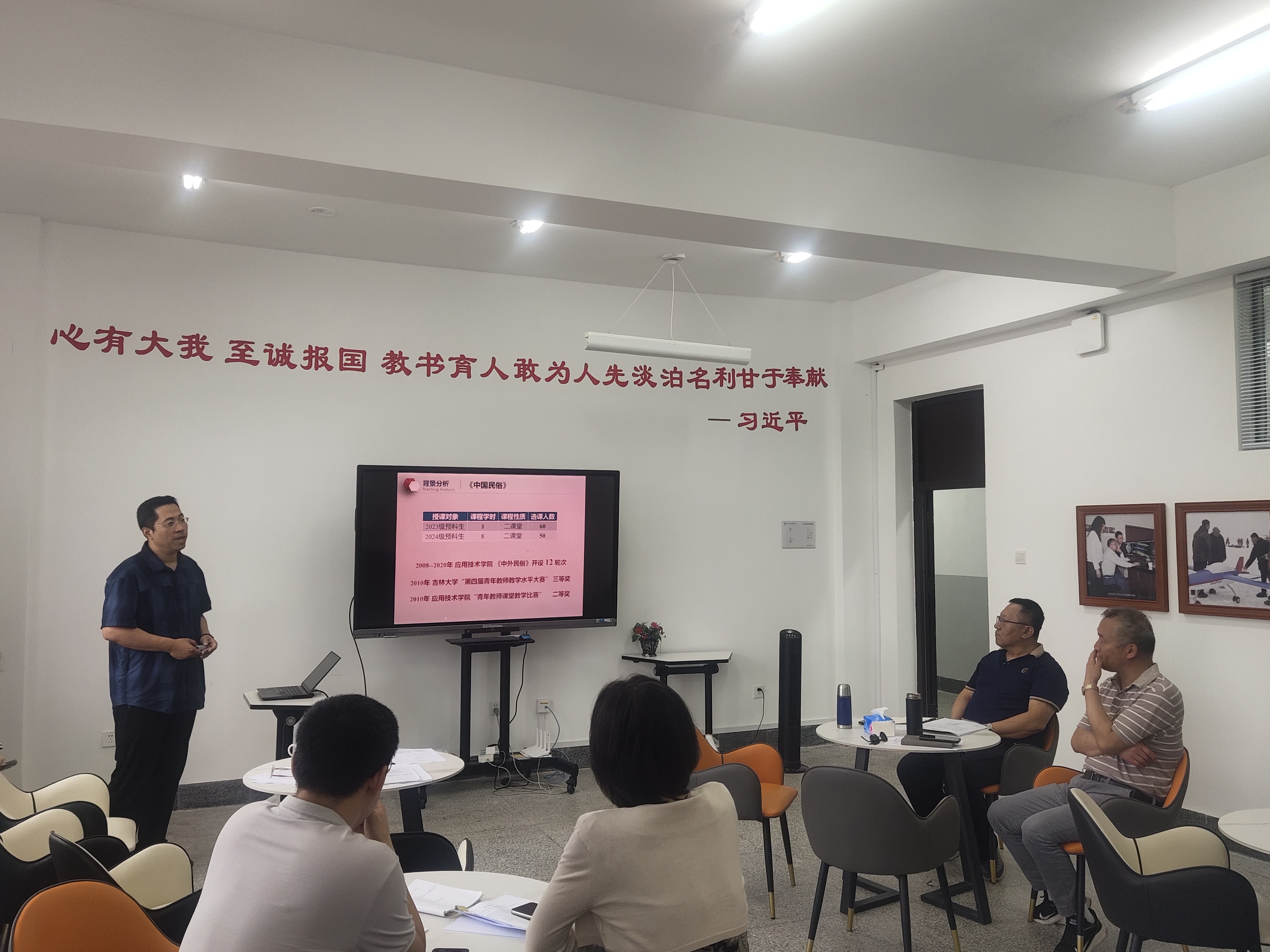 公司2025年教师试讲于6月19日下午在黄大年茶思屋509教室开展。新聘教师对《英语》课程进行试讲;郭亮老师对《中国民俗》和《经济学基础素养》两门二课堂课程转为选修课课程进行试讲。活动由教学委员会副主任周伟主持,全体教学委员会委员参加并担当评委。