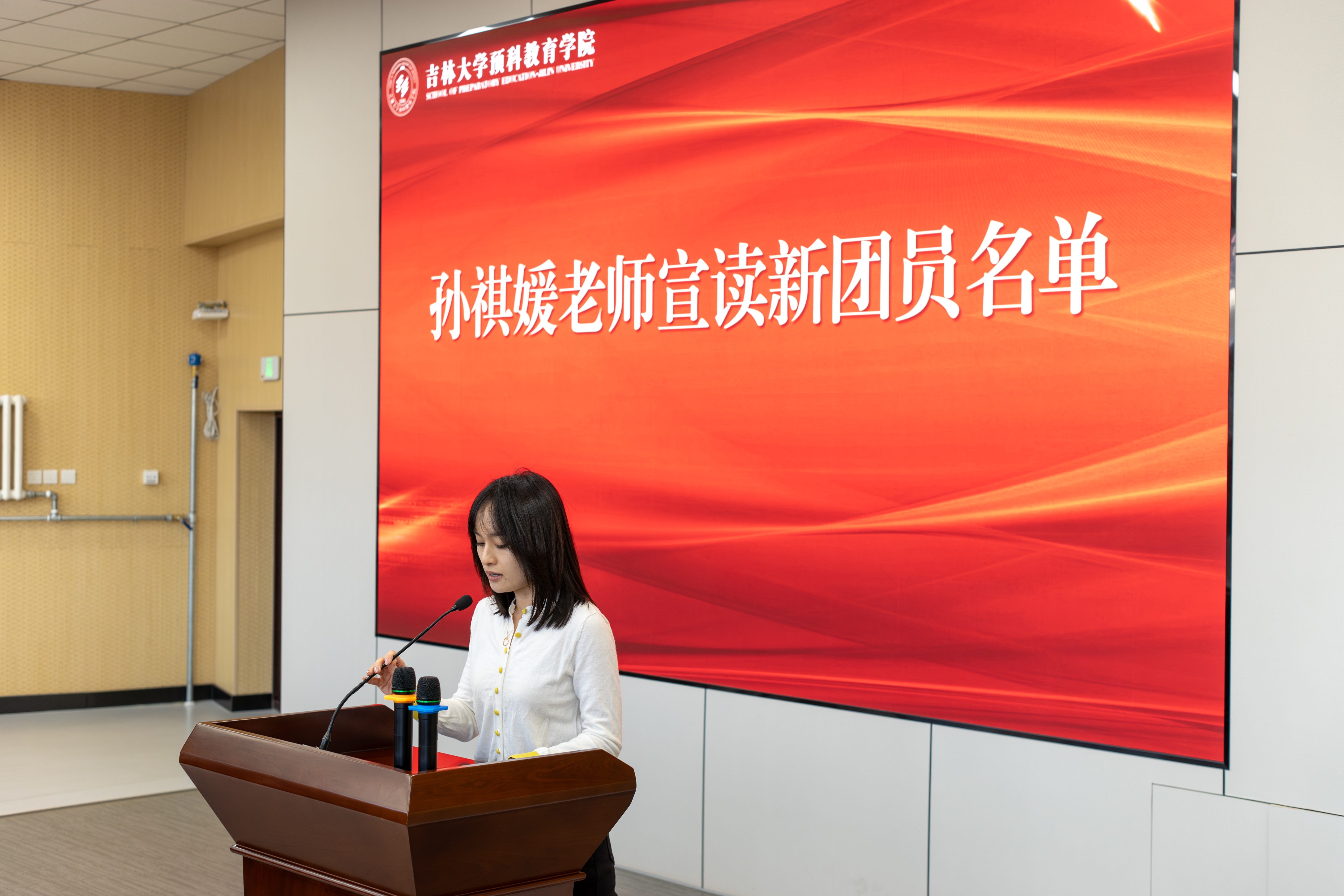 仪式在庄严的《中华人民共和国国歌》声中启幕。孙祺媛老师首先宣读新团员名单,田轲副书记为新团员佩戴团徽。在哈那提老师带领下,新团员庄严宣誓,老团员重温入团誓词,铮铮誓言铿锵有力,彰显着团员们的坚定信念与责任担当。