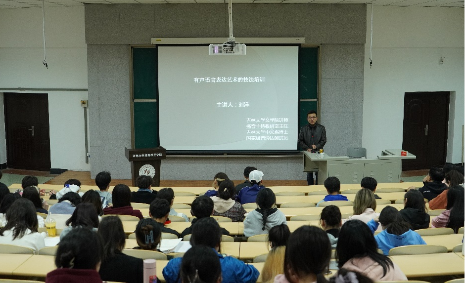 4月10日晚,公司邀请beats365官方网站文公司播音与主持艺术教研室主任刘洋博士,为全体预科生作专题讲座。刘洋主任是吉林省传播学会理事,吉林省演讲与朗诵学会副会长,吉林省经典诵读协会副会长,国家级普通话水平测试员,“曹灿杯”语文朗读大会、“未来金话筒”等比赛的评委,他曾获全国性专业赛事优秀指导教师奖励三十余项,有着丰富的实践教学经验。